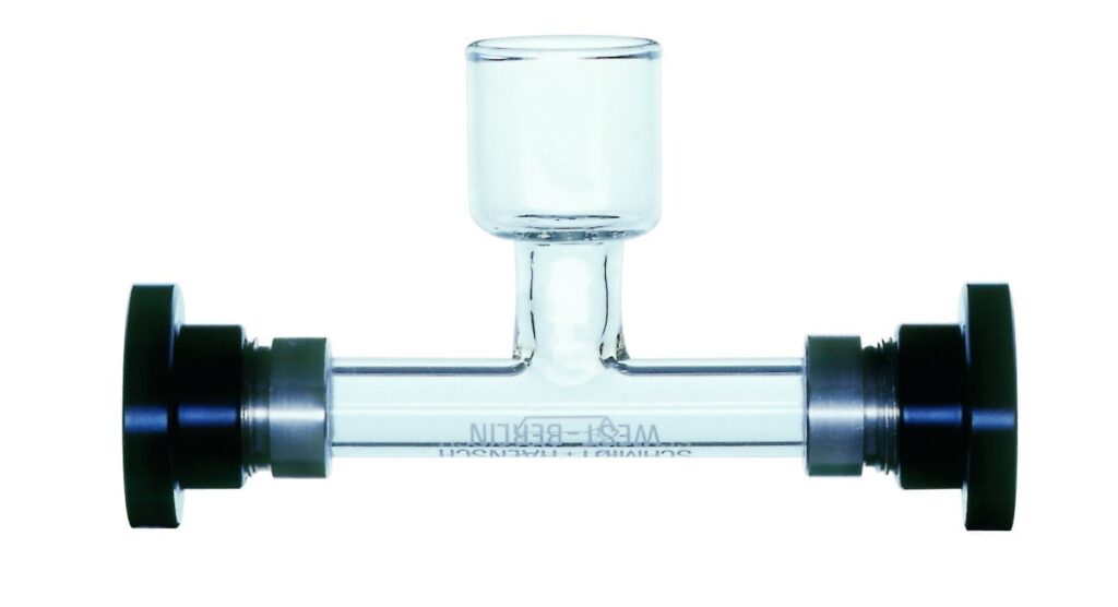 Les tubes d’échantillon en verre sont disponibles pour les mesures individuelles et sont équipés d’un piège à bulles standard pour un remplissage sans bulles.
