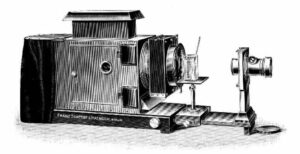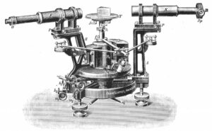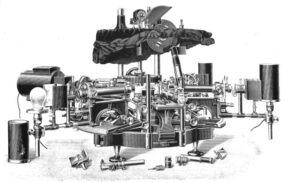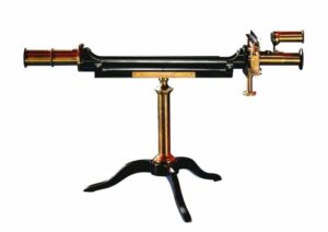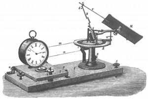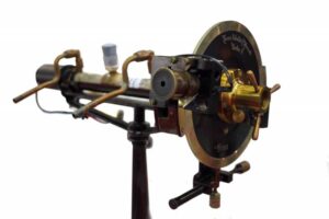 For lack of electric light, the heliostat also was part of the standard equipment of optical instruments at SCHMIDT + HAENSCH. Here sunlight was caught with a mirror and the changing position of the incident sunlight was compensated by a gear coupled to a clock.